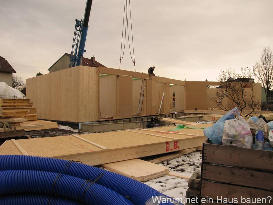 Heute wurde das Dach draufgelegt. Wie auf den Bildern zu erkennen ist, sieht das Haus damit schon wirklich fast wie ein Haus aus. Das Dach ist noch nicht fertig, es fehlt noch die Abdichtung, die äussere Isolierung und die Rollierung drauf. Leider ist es zeitlich ein wenig knapp geworden, weswegen die letzten Teile in leichtem Nieselregen aufgelegt werden mussten, und das bereits nach Einbruch der Dunkelheit. Aber die Hauptsache ist, dass der Zeitplan hält – ist wetterbedingt im Winter ja nicht so einfach. Natürlich gibt es auch davon ein Zeitraffervideo 🙂 Leider ist gegen Ende der Regenschutz ein wenig vor die Linse gerutscht, und ich weiss: insgesamt ist das Video am Ende zu Dunkel.